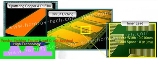Homray Micron Technology is a professional COF(Chip on Film)Tape and COF Package IC supplier. We are specialized in flexible drive IC Substrate-COF Film and COF (Chip on Film) Pattern Design and COF Package. Compared with the normal pitch COF (Chip on Film) process, fine pitch COF(Chip on Film) Technology is much more difficult,it requires quite precise etching factor and accurate pattern formation technology. Homray Micron Technology launched 18㎛ fine pitch COF(Chip on Film) for mass production.