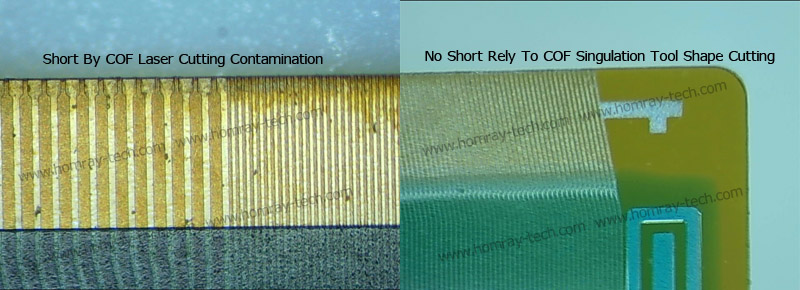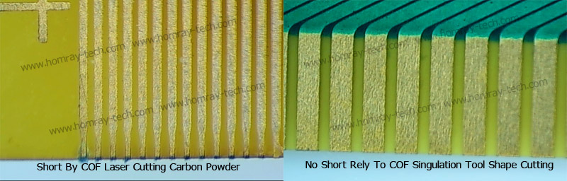Reel COF Laser cutting relies on instant high temperature, but there're carbon powder or ash remains on the film cutting edge.The carbon powders or ash remains( contamination) will cause the short when it perform OLB process bonding with PCB and Panel side. But the Reel COF Singulation Machine make use of accurate cylinder stamping by precise reel COF steel punch tool. It's the most reliable and most stable Reel COF shape cutting and Reel COF Shape Punch way for mass production.