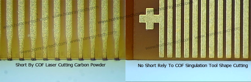 Reel COF Laser cutting relies on instant high temperature, but there're carbon powder or ash remains on the film cutting edge.The carbon powders or ash remains( contamination) will cause the short when it perform OLB process bonding with PCB and Panel side. But the Reel COF Singulation Machine make use of accurate cylinder stamping by precise reel COF steel punch tool. It's the most reliable and most stable Reel COF shape cutting and Reel COF Shape Punch way for mass production.